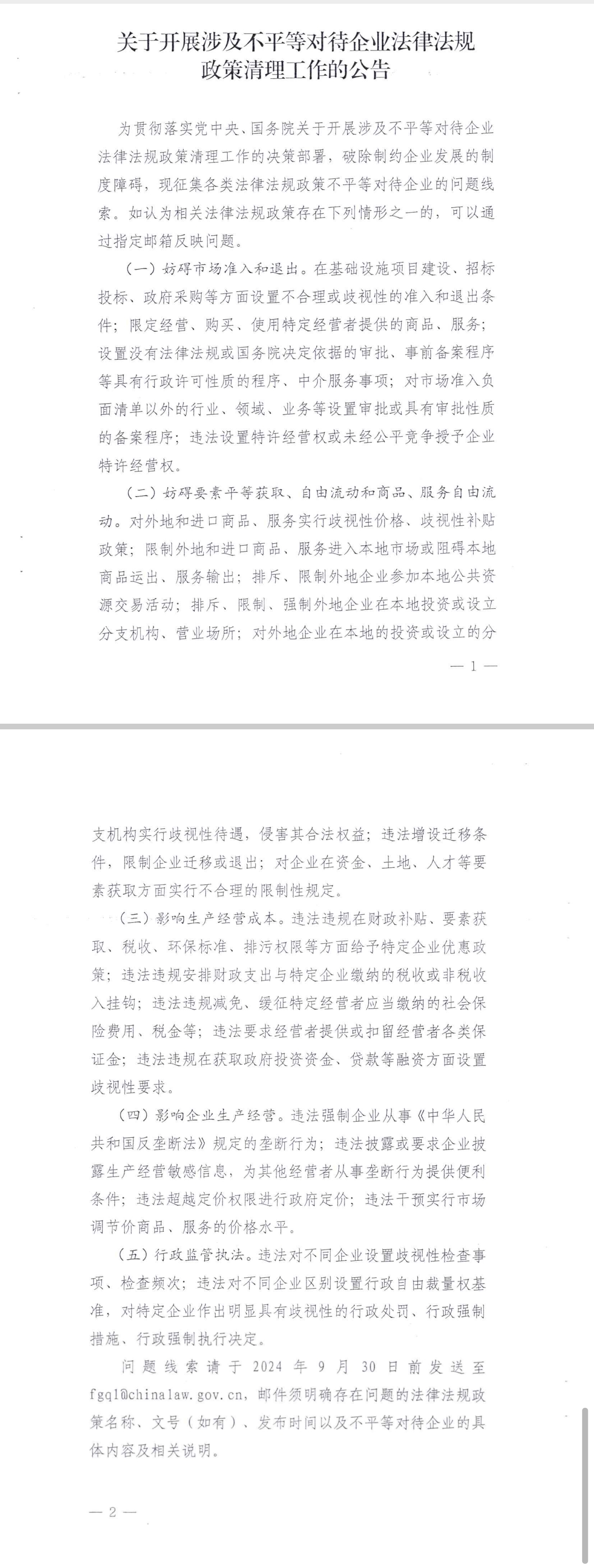 關(guān)于開展涉及不平等對(duì)待企業(yè)法律法規(guī)政策清理工作的公告