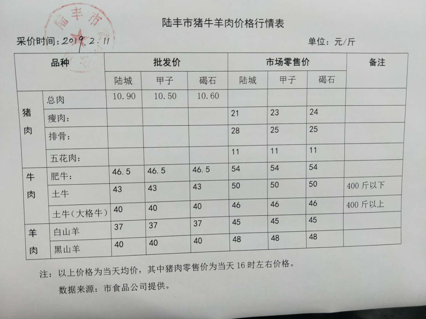 陸豐市豬牛羊肉價格行情表(2019年2月11日)