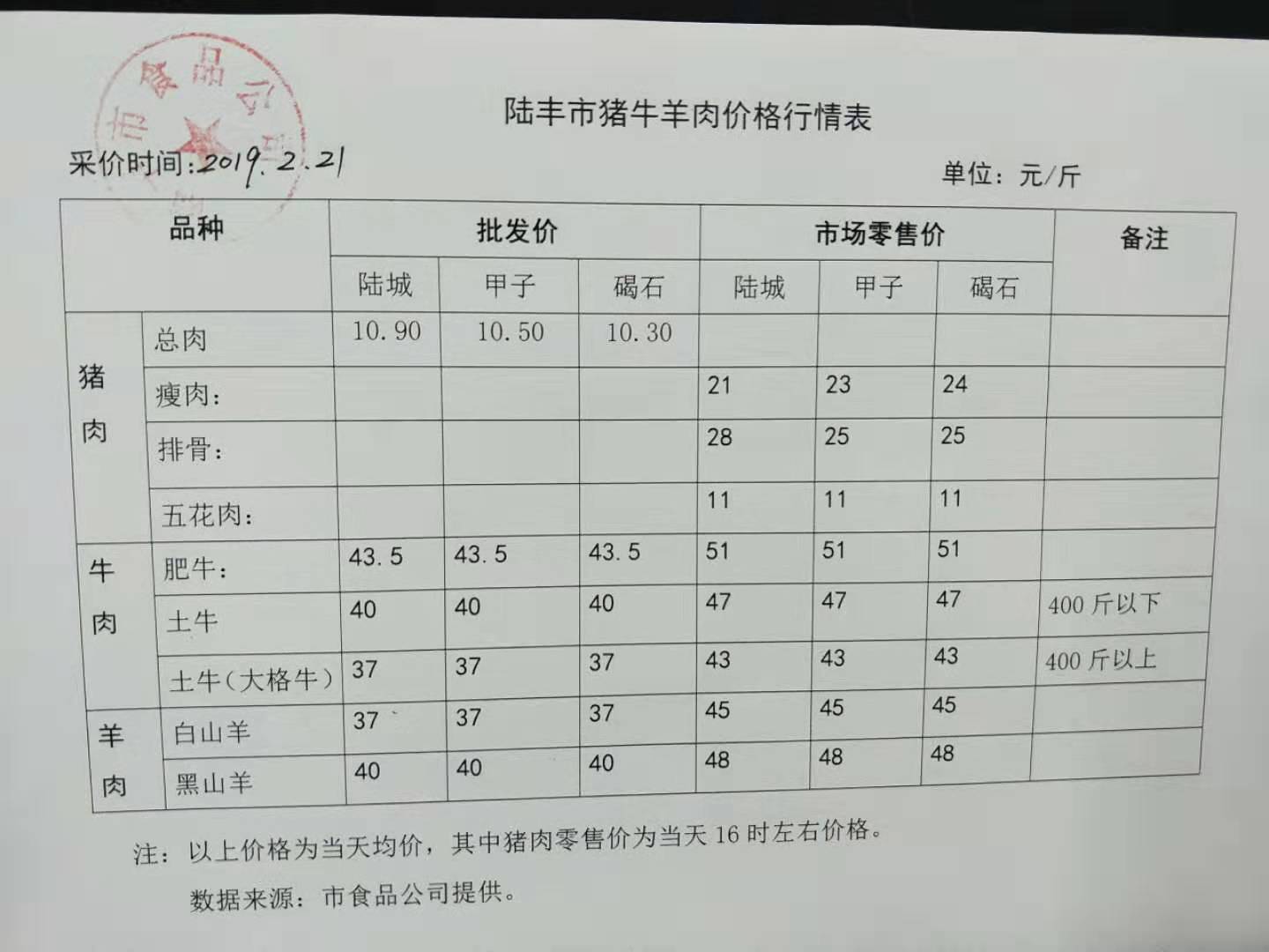 陸豐市豬牛羊肉價格行情表(2019年2月21日)