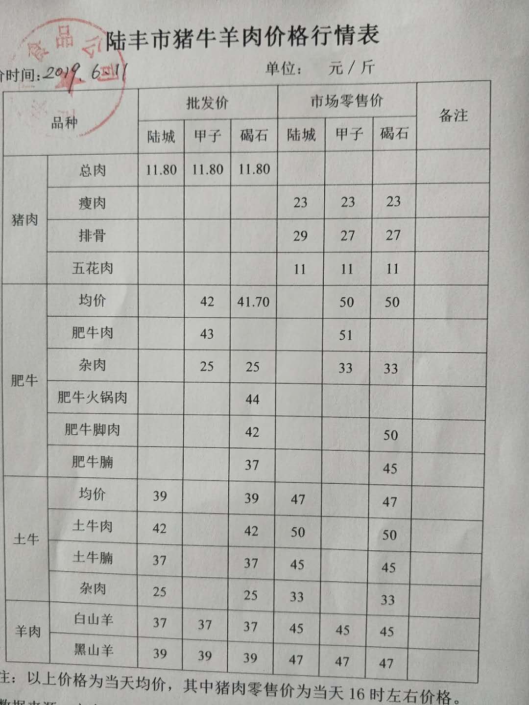陸豐市豬牛羊價格行情表(2019年6月11日)