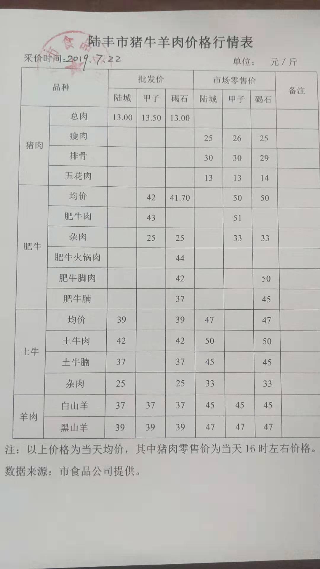陸豐市豬牛羊肉價格行情表(2019年7月22日)