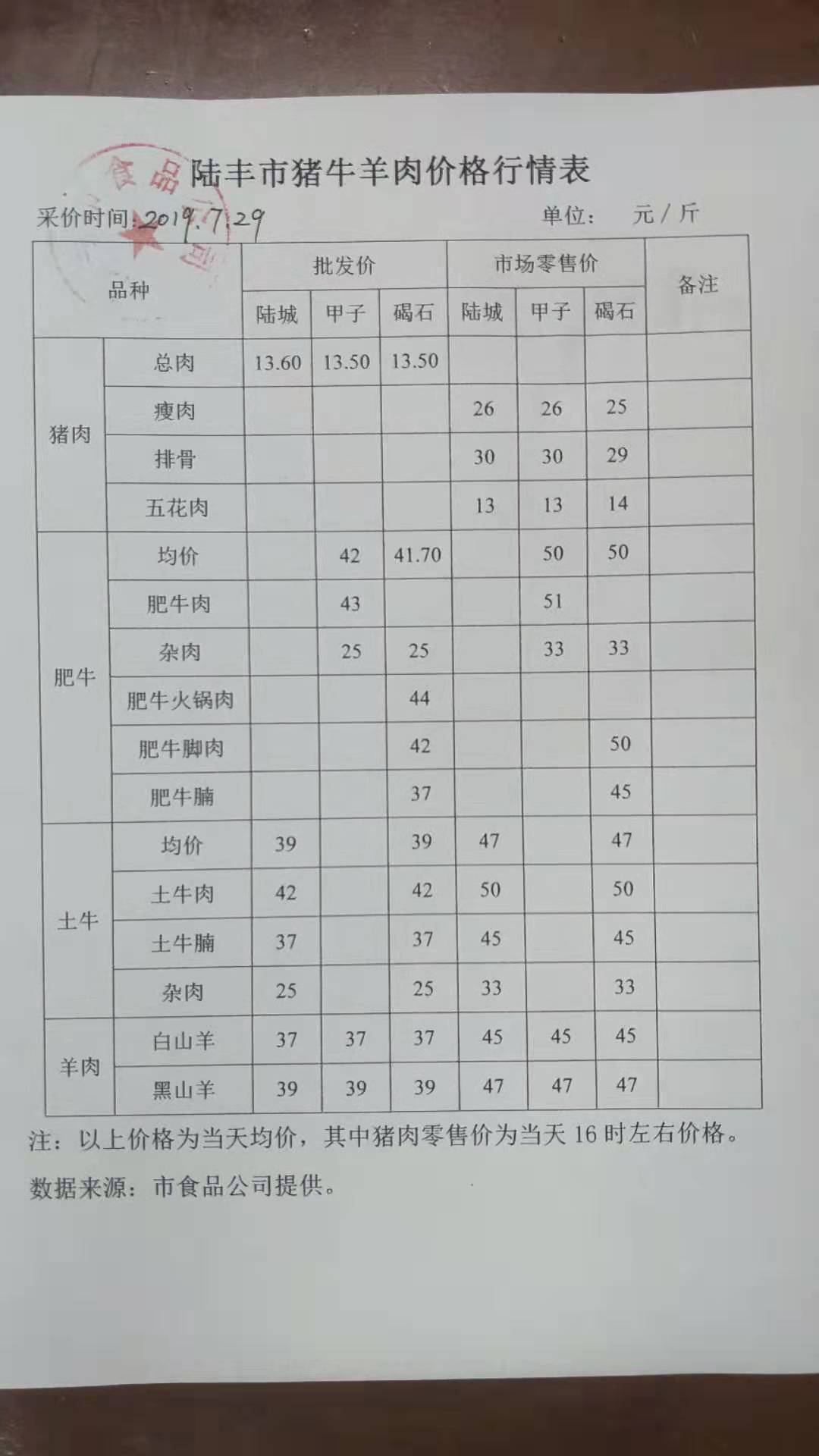 陸豐市豬牛羊肉價(jià)格行情表(2019年7月29日)