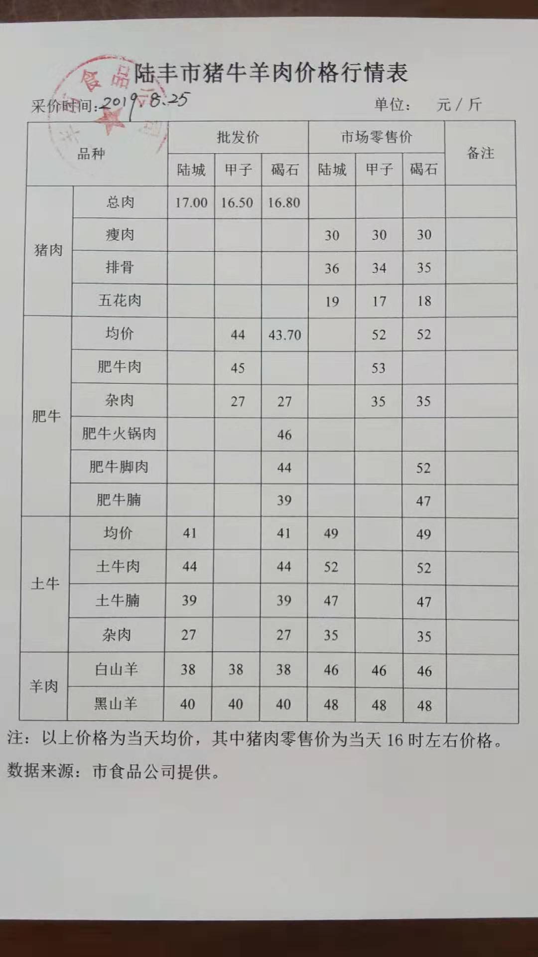 陸豐市豬牛羊肉價格行情表(2019年8月25日)