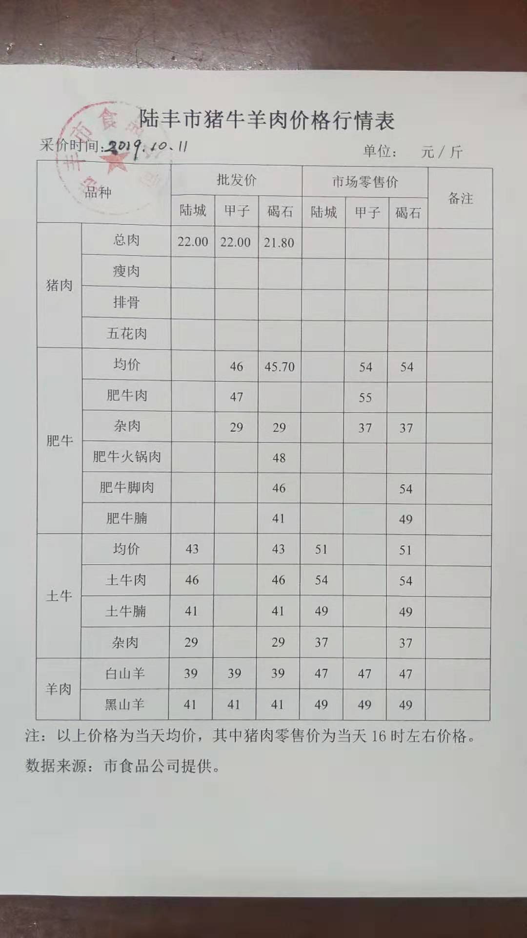 陸豐市豬牛羊肉價(jià)格行情表(2019年10月11日)
