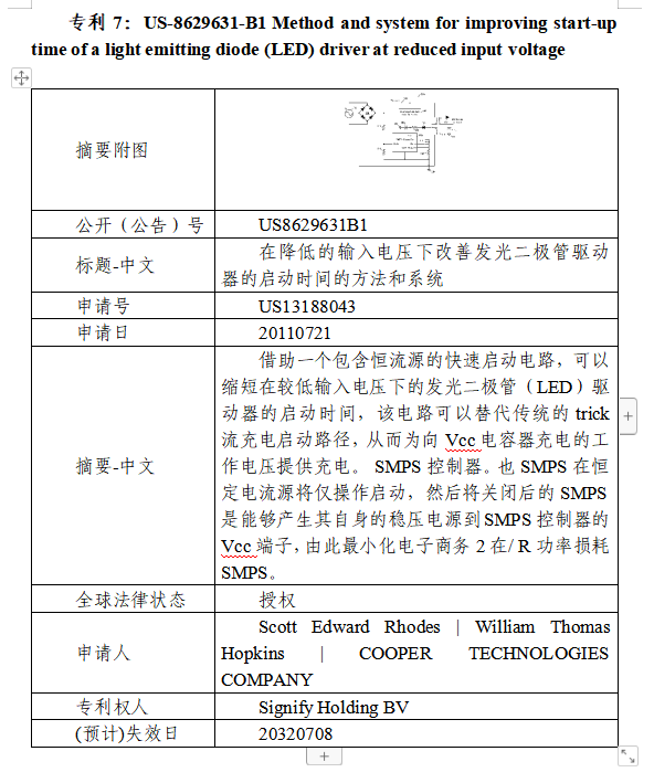 涉案專利共20件,涉及LED驅(qū)動電路、光學(xué)元件、系統(tǒng)架構(gòu)等,專利信息詳見下表。值得注意的是,在20件涉案專利中,有7件專利在Signify和Current的訴訟中均有涉及,11件專利由Current提起不侵權(quán)宣告而并未被Signify作為專利侵權(quán)訴訟基礎(chǔ),2件專利Signify作為專利侵權(quán)訴訟基礎(chǔ)但Current未提起不侵權(quán)宣告。