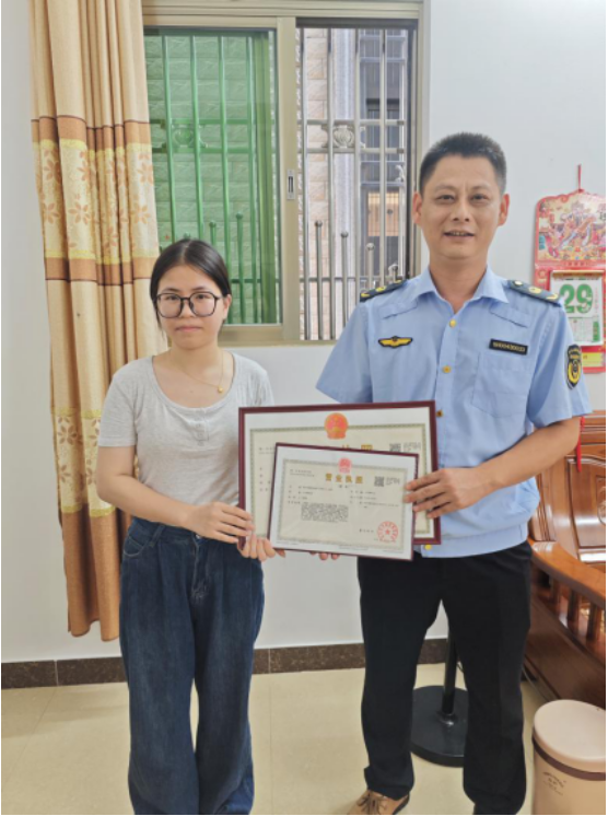 9月29日,陸豐市市場監(jiān)督管理局行政許可和登記注冊股的工作人員將嶄新的營業(yè)執(zhí)照送到楊女士手中?!盃I業(yè)執(zhí)照變更太方便了,不用注銷個體直接轉(zhuǎn)型,為我們解決了大難題!”楊女士高興地對工作人員說。