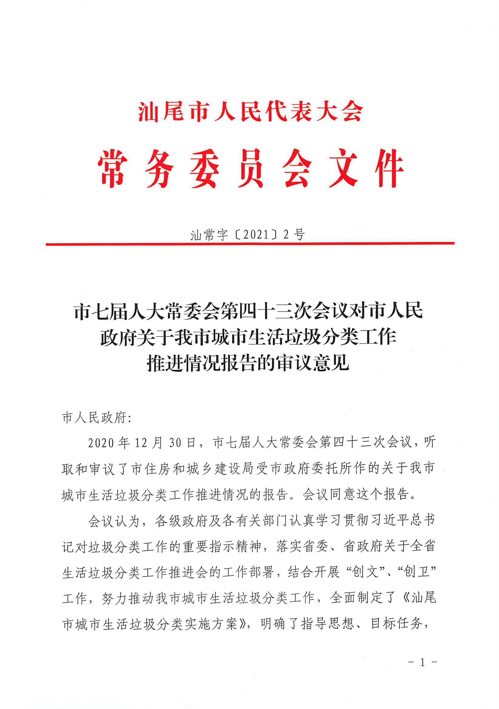 市七屆人大常委會第四十三次會議對市人民政府關(guān)于我市城市生活垃圾分類工作推進(jìn)情況報告的審議意見