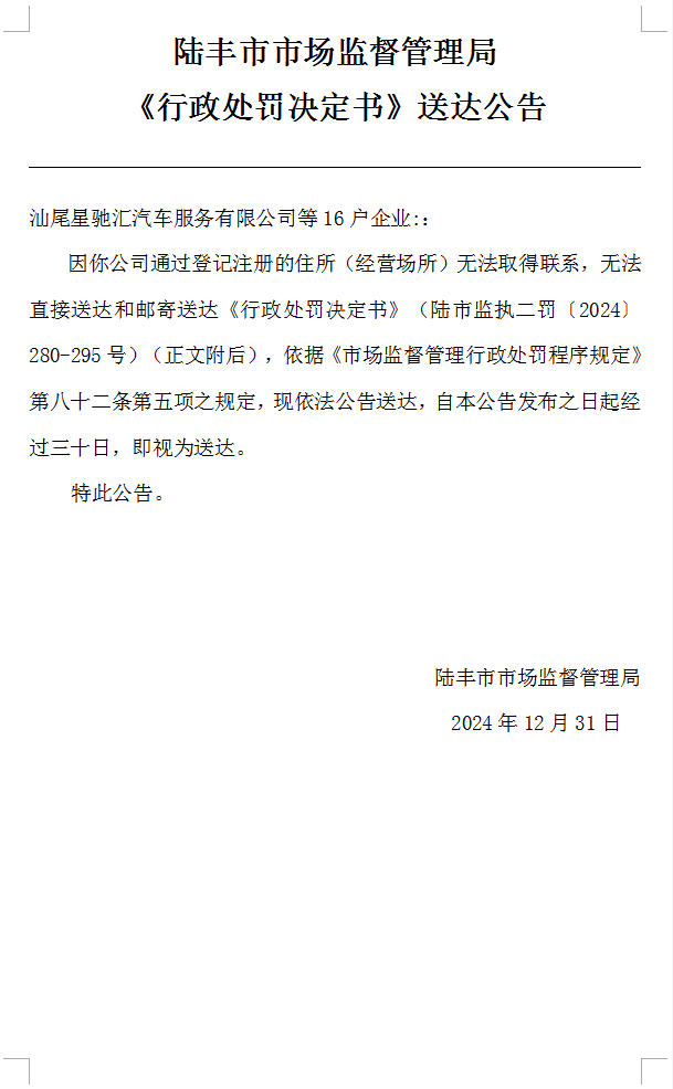 陸豐市市場監(jiān)督管理局《行政處罰決定書》送達公告