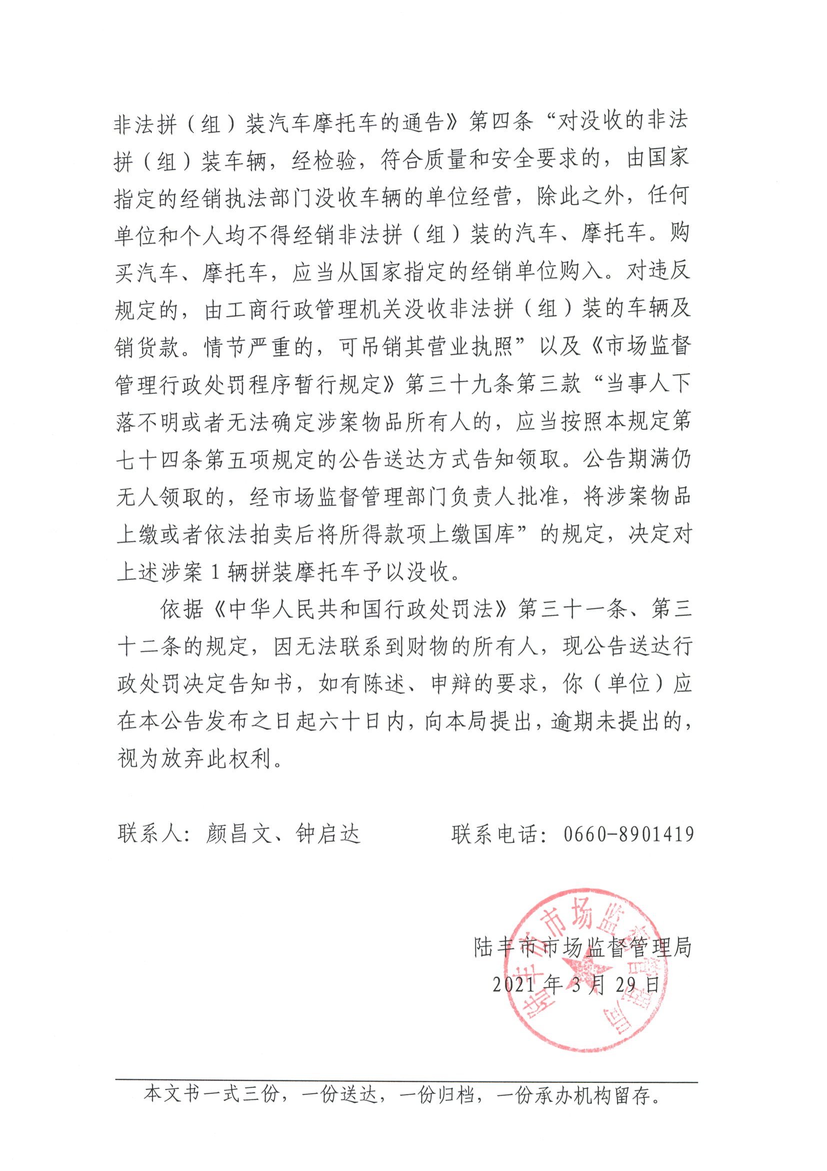 陸豐市市場(chǎng)監(jiān)督管理局無(wú)人認(rèn)領(lǐng)財(cái)物行政處罰決定告知公告