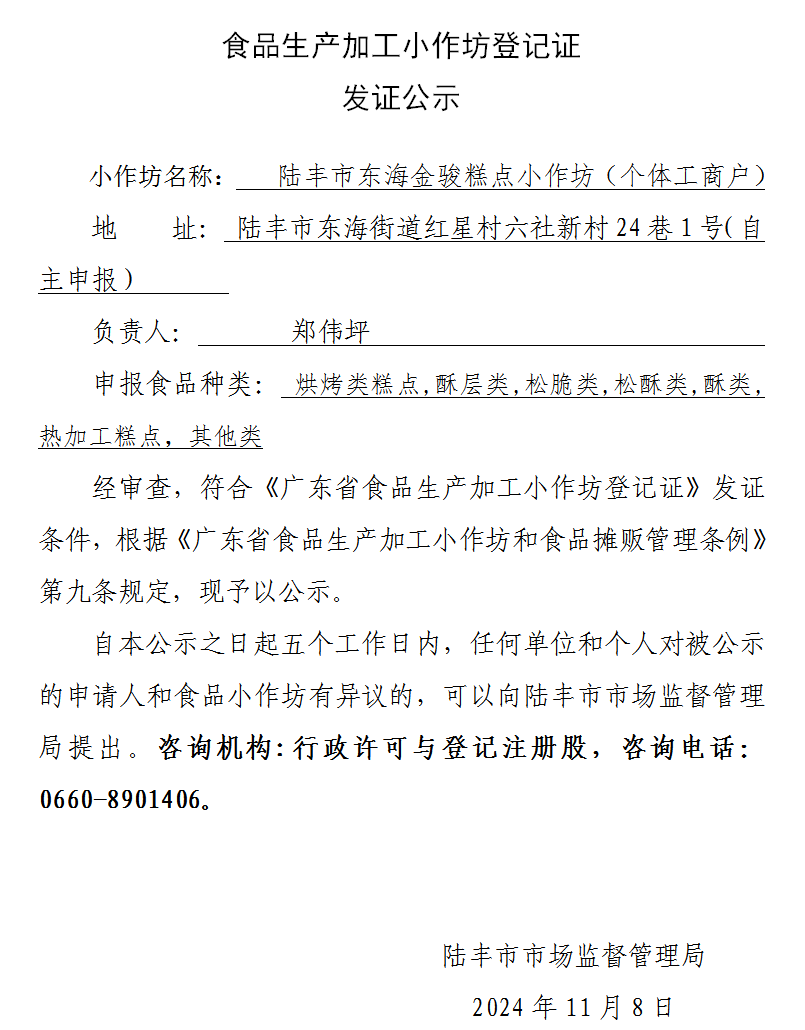 經(jīng)審查,陸豐市東海金駿糕點小作坊(個體工商戶)符合《廣東省食品生產(chǎn)加工小作坊登記證》發(fā)證條件,根據(jù)《廣東省食品生產(chǎn)加工小作坊和食品攤販管理條例》第九條規(guī)定,現(xiàn)予以公示。