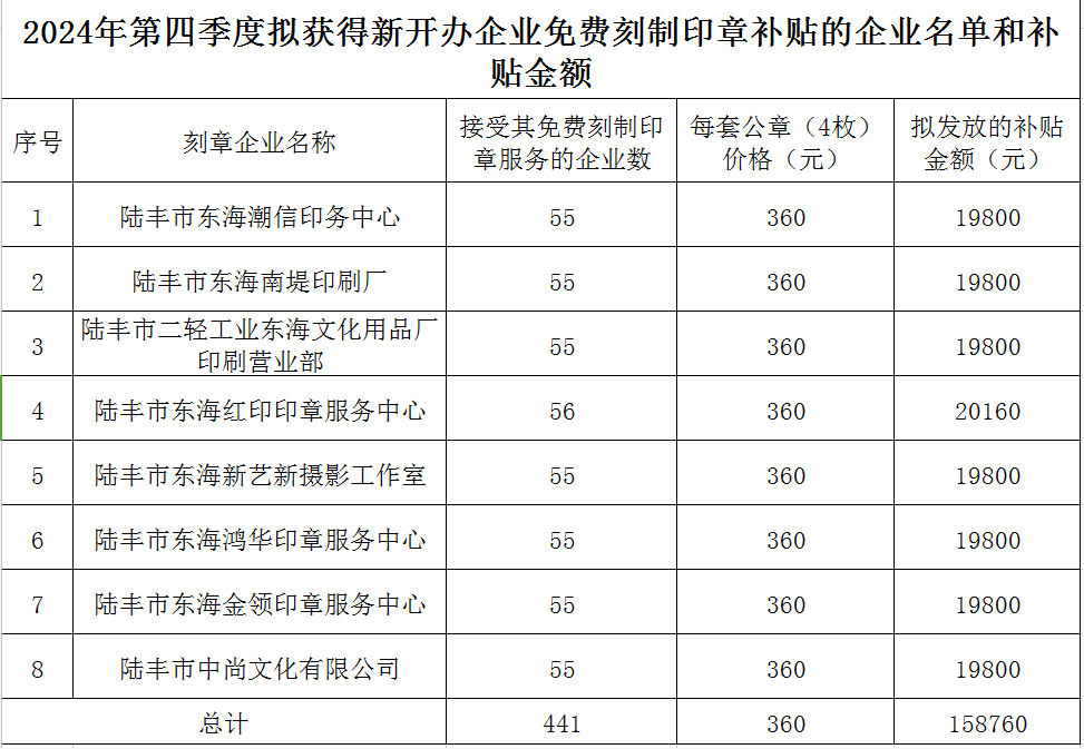 2024年第四季度擬獲得新開辦企業(yè)免費(fèi)刻制印章補(bǔ)貼的企業(yè)名單和補(bǔ)貼金額