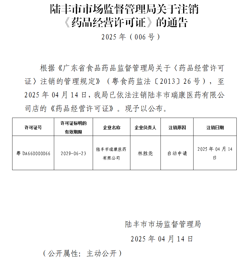 陸豐市市場監(jiān)督管理局關(guān)于注銷《藥品經(jīng)營許可證》的通告