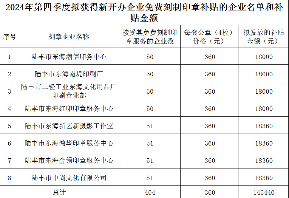 2025年第一季度擬獲得新開(kāi)辦企業(yè)免費(fèi)刻制印章補(bǔ)貼的企業(yè)名單和補(bǔ)貼金額