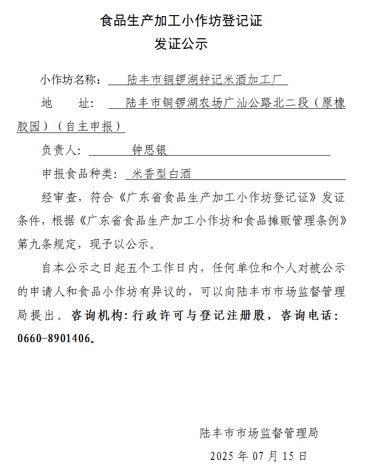 食品生產(chǎn)加工小作坊登記證發(fā)證公示