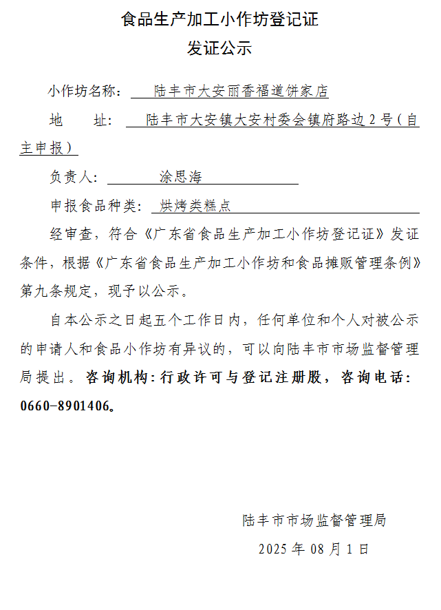 食品生產(chǎn)加工小作坊登記證發(fā)證公示