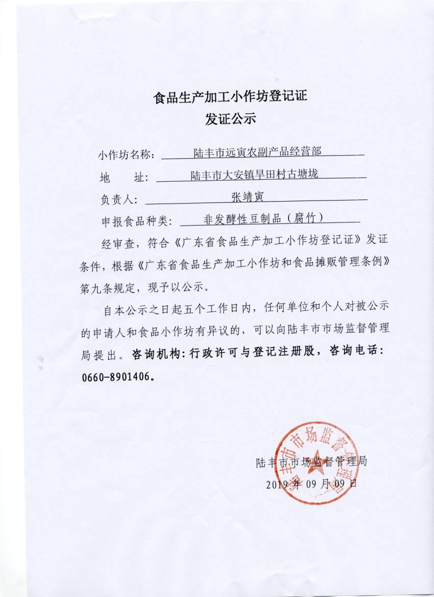 食品生產(chǎn)加工小作坊登記證發(fā)證公示(陸豐市遠(yuǎn)寅農(nóng)副產(chǎn)品經(jīng)營(yíng)部)