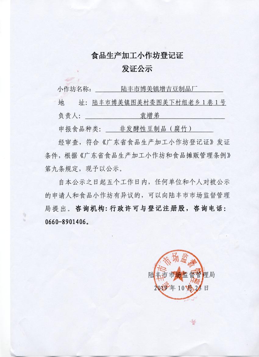 食品生產(chǎn)加工小作坊登記證發(fā)證公示(陸豐市博美鎮(zhèn)增吉豆制品廠)