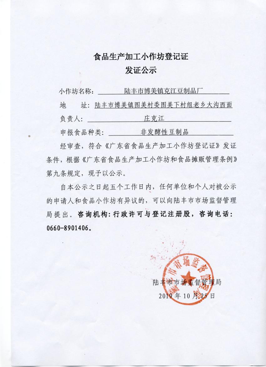 食品生產(chǎn)加工小作坊登記證發(fā)證公示(陸豐市博美鎮(zhèn)克江豆制品廠)