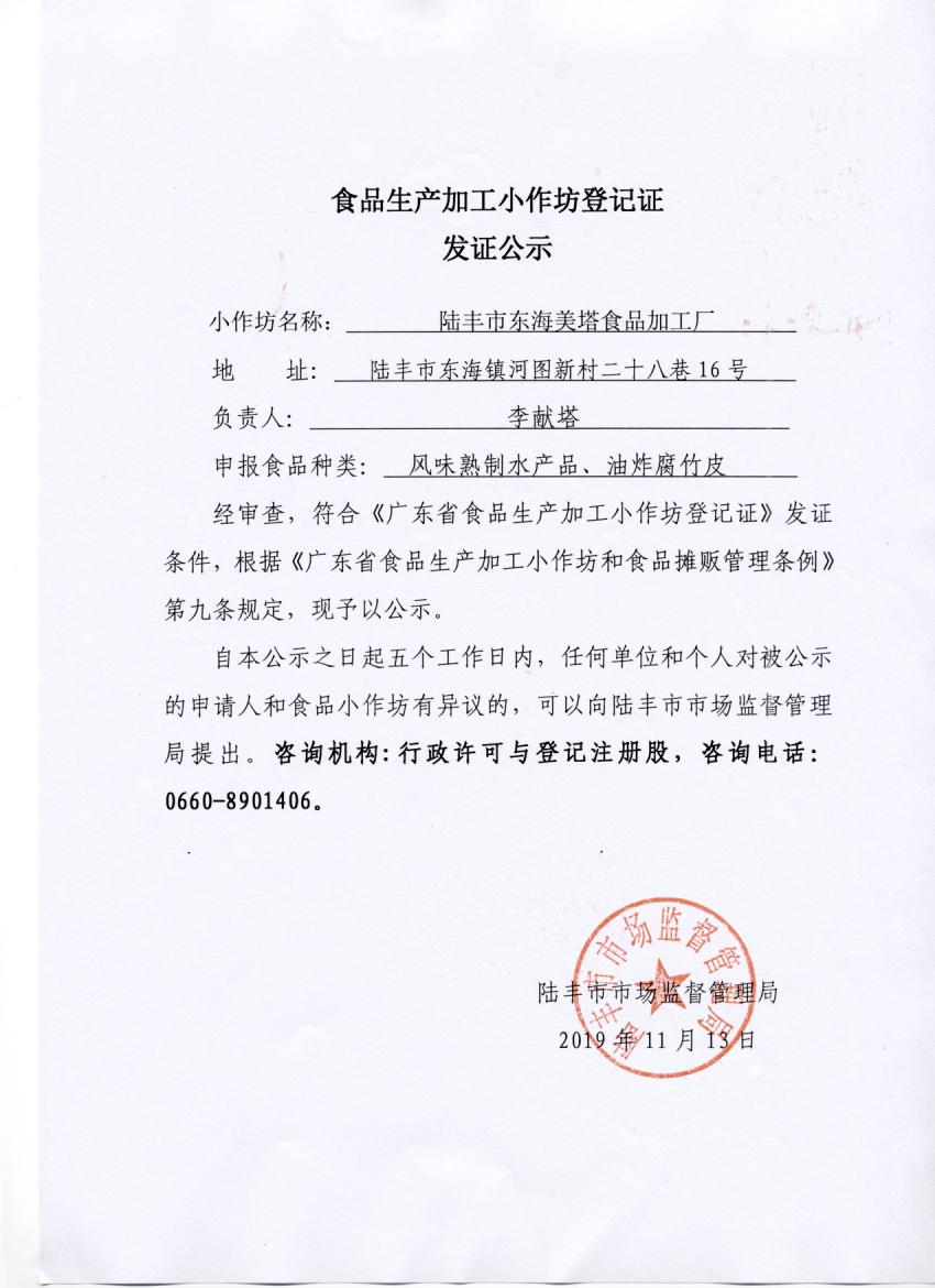食品生產(chǎn)加工小作坊登記證發(fā)證公示(陸豐市東海美塔食品加工廠)