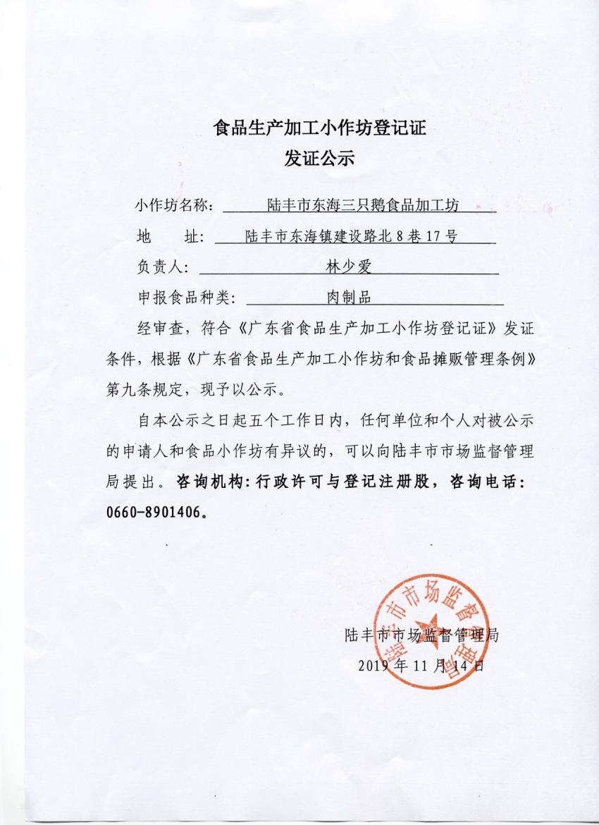 食品生產(chǎn)加工小作坊登記證發(fā)證公示(陸豐市東海三只鵝食品加工坊)