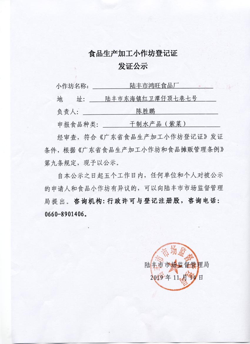 食品生產(chǎn)加工小作坊登記證發(fā)證公示(陸豐市鴻旺食品廠)