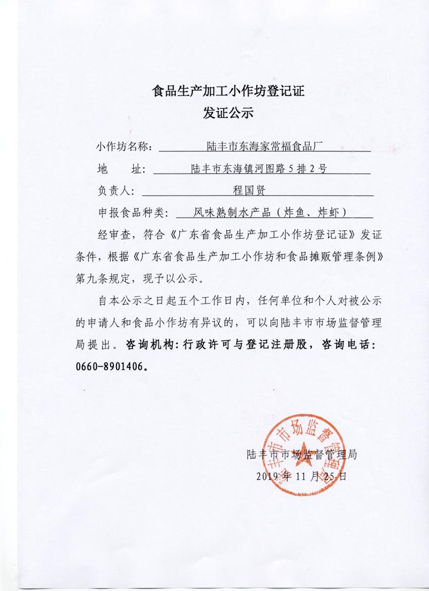 食品生產(chǎn)加工小作坊登記證發(fā)證公示(陸豐市東海家常福食品廠廠)