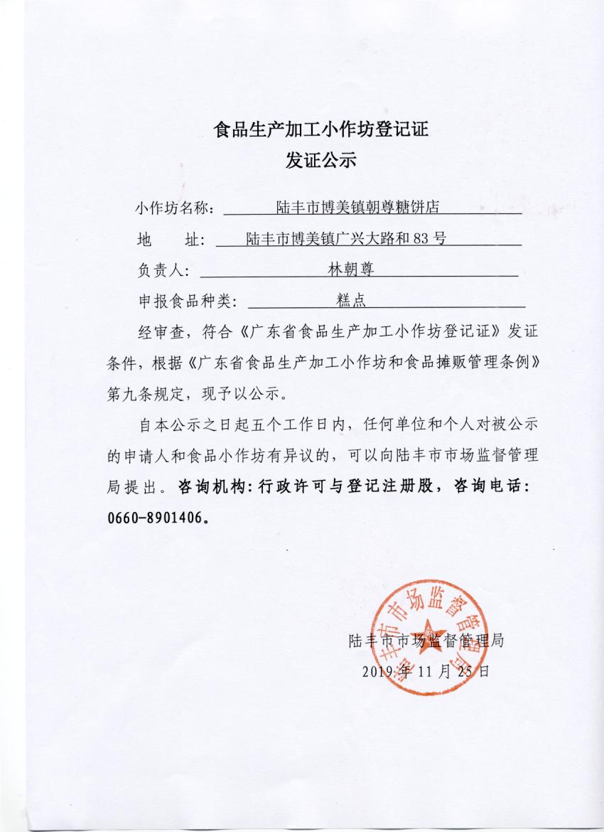 食品生產(chǎn)加工小作坊登記證發(fā)證公示(陸豐市博美鎮(zhèn)朝尊糖餅店)