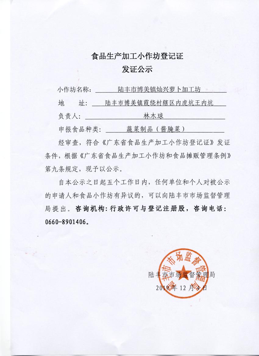 食品生產(chǎn)加工小作坊登記證發(fā)證公示(陸豐市博美鎮(zhèn)燦興蘿卜加工坊)