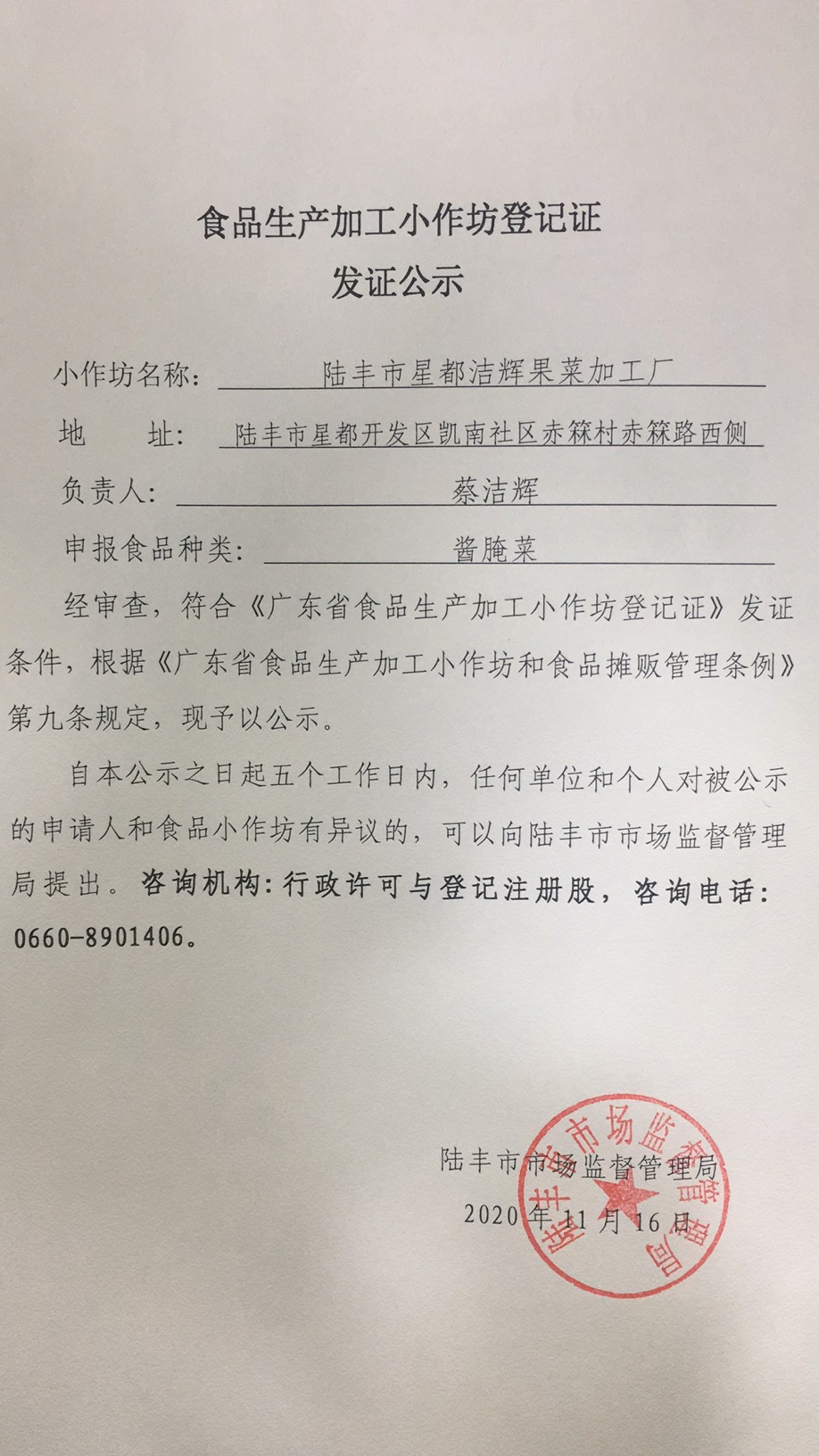 食品生產(chǎn)加工小作坊登記證發(fā)證公示(陸豐市星都潔輝果菜加工廠)