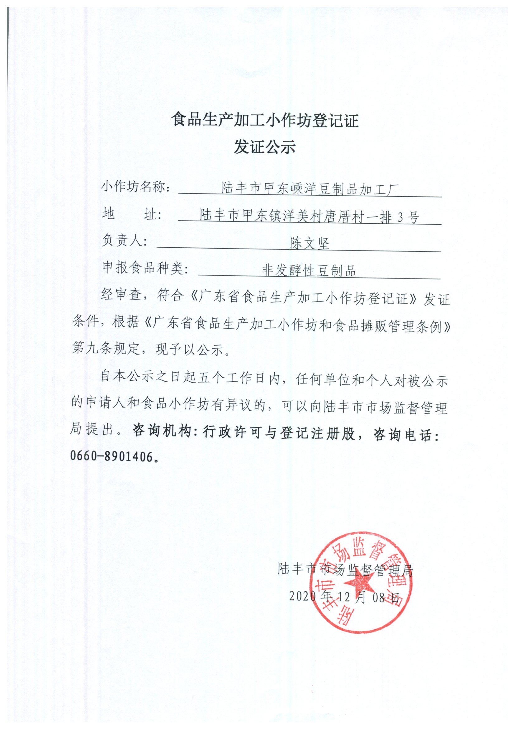 食品加工小作坊登記證發(fā)證公示(陸豐市甲東嵊洋豆制品加工廠)