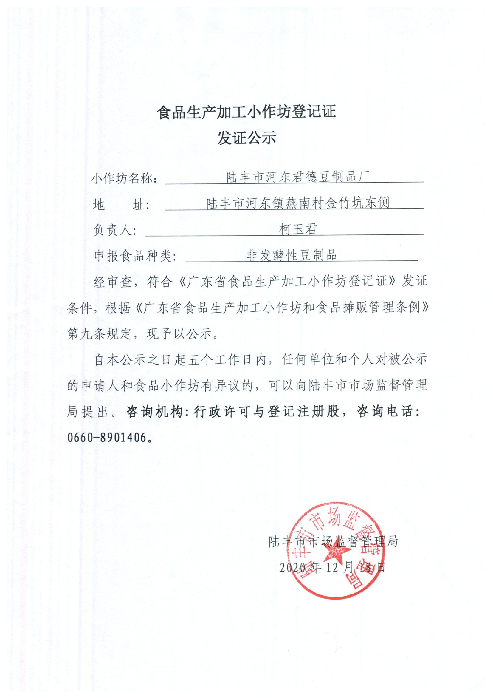 食品生產(chǎn)加工小作坊登記證發(fā)證公示