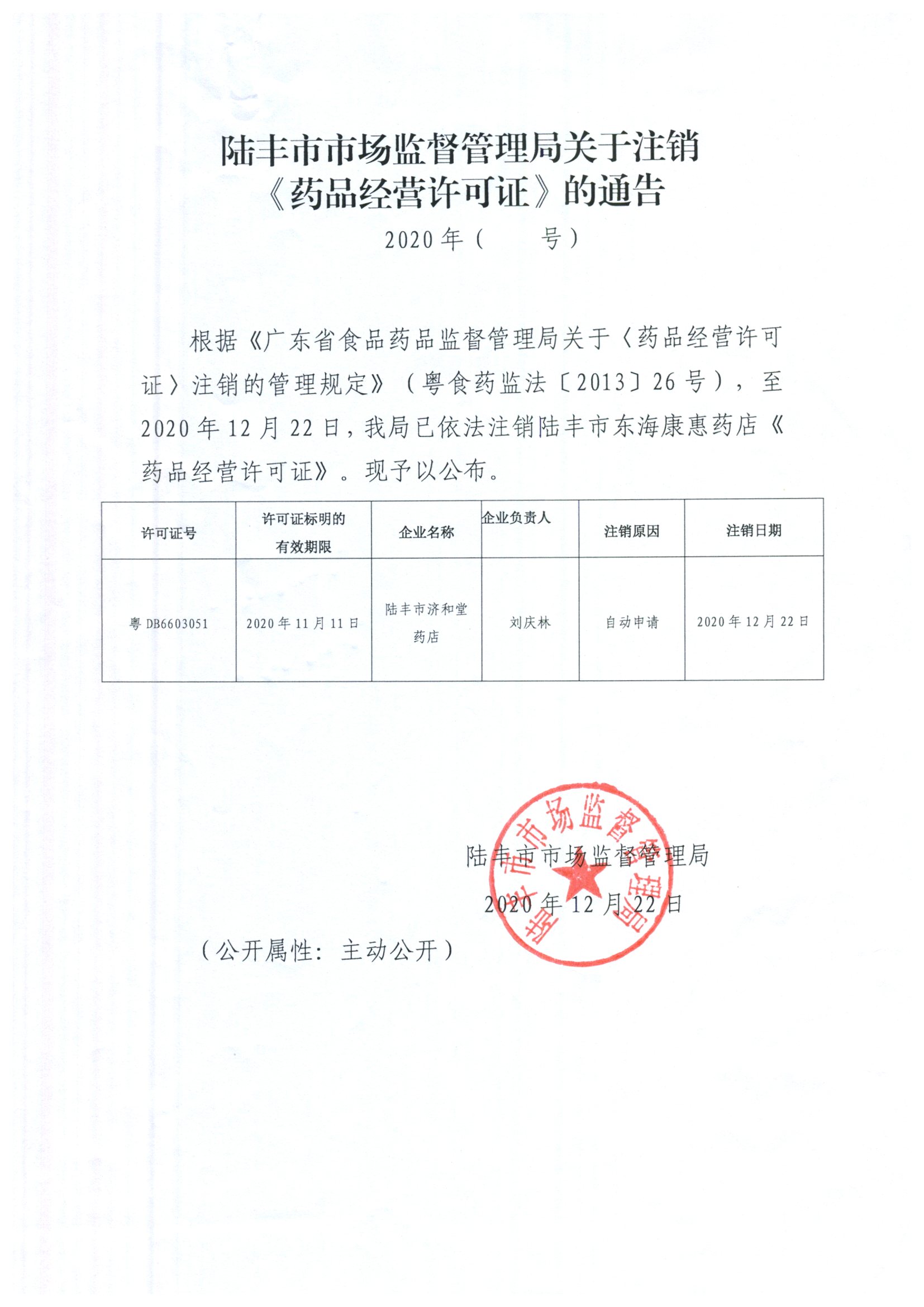 陸豐市市場監(jiān)督管理局關(guān)于注銷《藥品經(jīng)營許可證》的通告