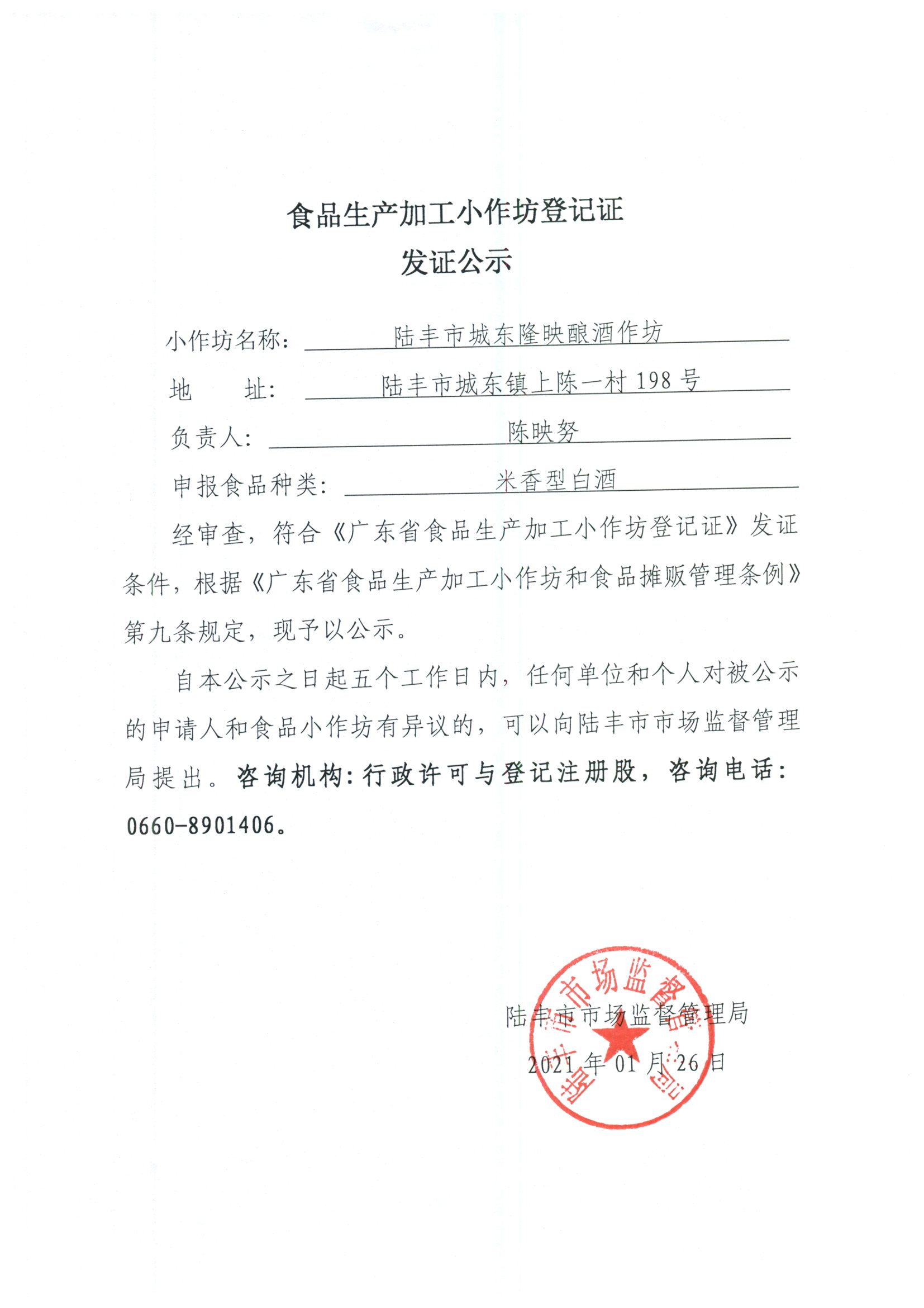 經(jīng)審查,陸豐市博美鎮(zhèn)錦標豆制品廠等3戶小作坊符合《廣東省食品生產(chǎn)加工小作坊登記證》發(fā)證條件,根據(jù)《廣東省食品生產(chǎn)加工小作坊和食品攤販管理條例》第九條規(guī)定,現(xiàn)予以公示。