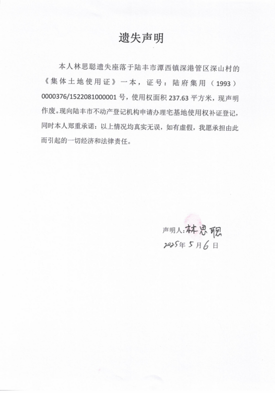 林思聰 | 陸豐市潭西鎮(zhèn)深港管區(qū)深山村 | 《集體土地使用證》 | 陸府集用(1993)第0000376/1522081000001號 | 237.63平方米 |