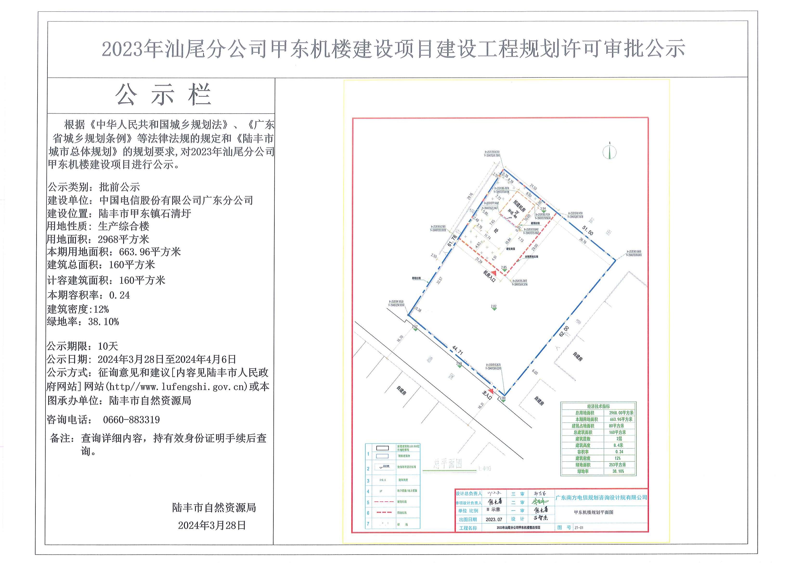 2023年汕尾分公司甲東機樓建設(shè)項目建設(shè)工程規(guī)劃許可審批公示