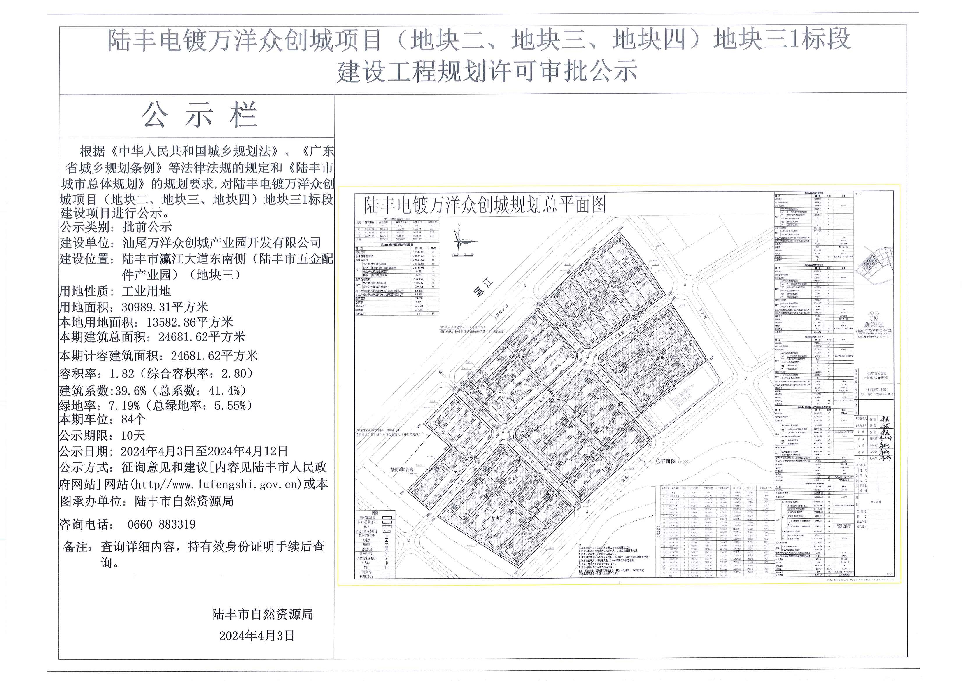 陸豐電鍍?nèi)f洋眾創(chuàng)城項(xiàng)目(地塊二、地塊三、地塊四)地塊三1標(biāo)段建設(shè)工程規(guī)劃許可審批公示