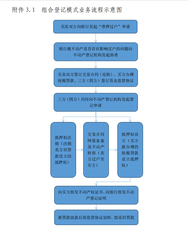 1.組合登記模式:通過借新貸、還舊貸無縫銜接實現(xiàn)“帶押過戶”的,不動產(chǎn)登記機構根據(jù)申請按序?qū)⒌盅簷嘧N(注銷賣方舊貸款設立的抵押權)、交易合同網(wǎng)簽備案及不動產(chǎn)轉(zhuǎn)移(賣方過戶至買方)、抵押權設立(買方新辦理的按揭貸款設立抵押權)合并辦理。