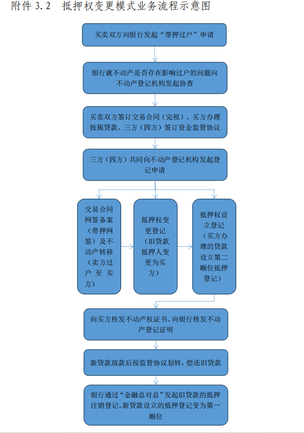 2.抵押權變更模式:通過借新貸、過戶后(舊抵押權變更)并還舊貸實現(xiàn)“帶押過戶”的,不動產(chǎn)登記機構根據(jù)申請按序?qū)⒔灰缀贤W(wǎng)簽備案及不動產(chǎn)轉(zhuǎn)移(賣方過戶至買方)、抵押權變更(原設立的抵押人隨房屋所有權轉(zhuǎn)移變更為買方)、抵押權設立(買方新辦理的按揭貸款設立第二順位抵押權)合并辦理。