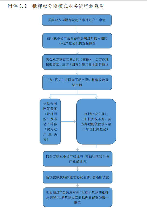 3.抵押權分段模式:通過借新貸、過戶后(舊抵押權不變)并還舊貸實現(xiàn)“帶押過戶”的,不動產(chǎn)登記機構根據(jù)申請按序?qū)⒔灰缀贤W(wǎng)簽備案及不動產(chǎn)轉(zhuǎn)移(賣方過戶至買方)、抵押權設立(買方新辦理的按揭貸款設立第二順位抵押權)合并辦理。
