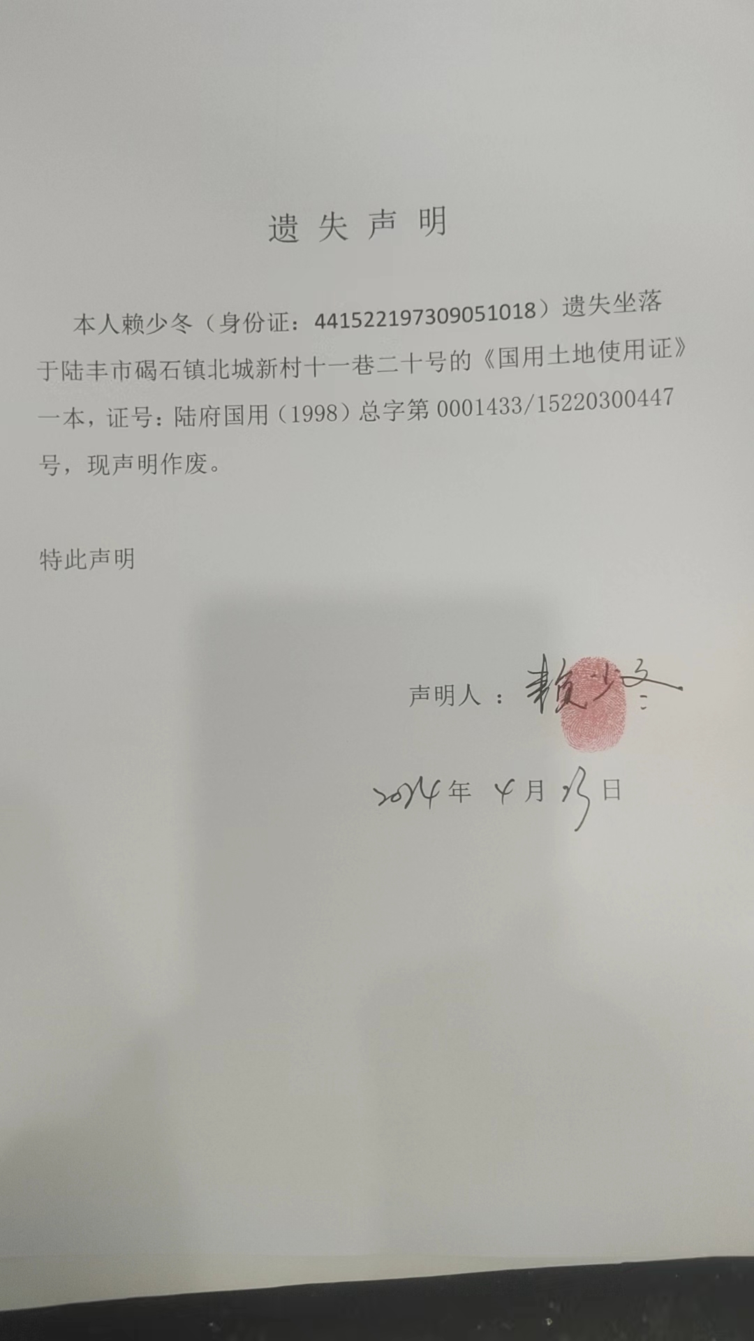遺失聲明:本人賴少冬遺失坐落于陸豐市碣石鎮(zhèn)北城新村十一巷二十號的《國用土地使用證》一本,證號: