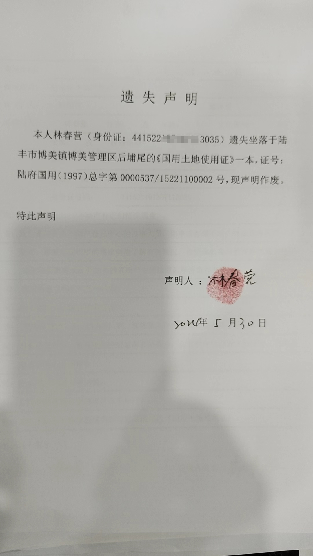 本人林春營(身份證:441522********3035)遺失坐落于陸豐市博美鎮(zhèn)博美管理區(qū)后埔尾的《國用土地使用證》一本,證號:陸府國用(1997)總字第0000537/15221100002號,現(xiàn)聲明作廢。