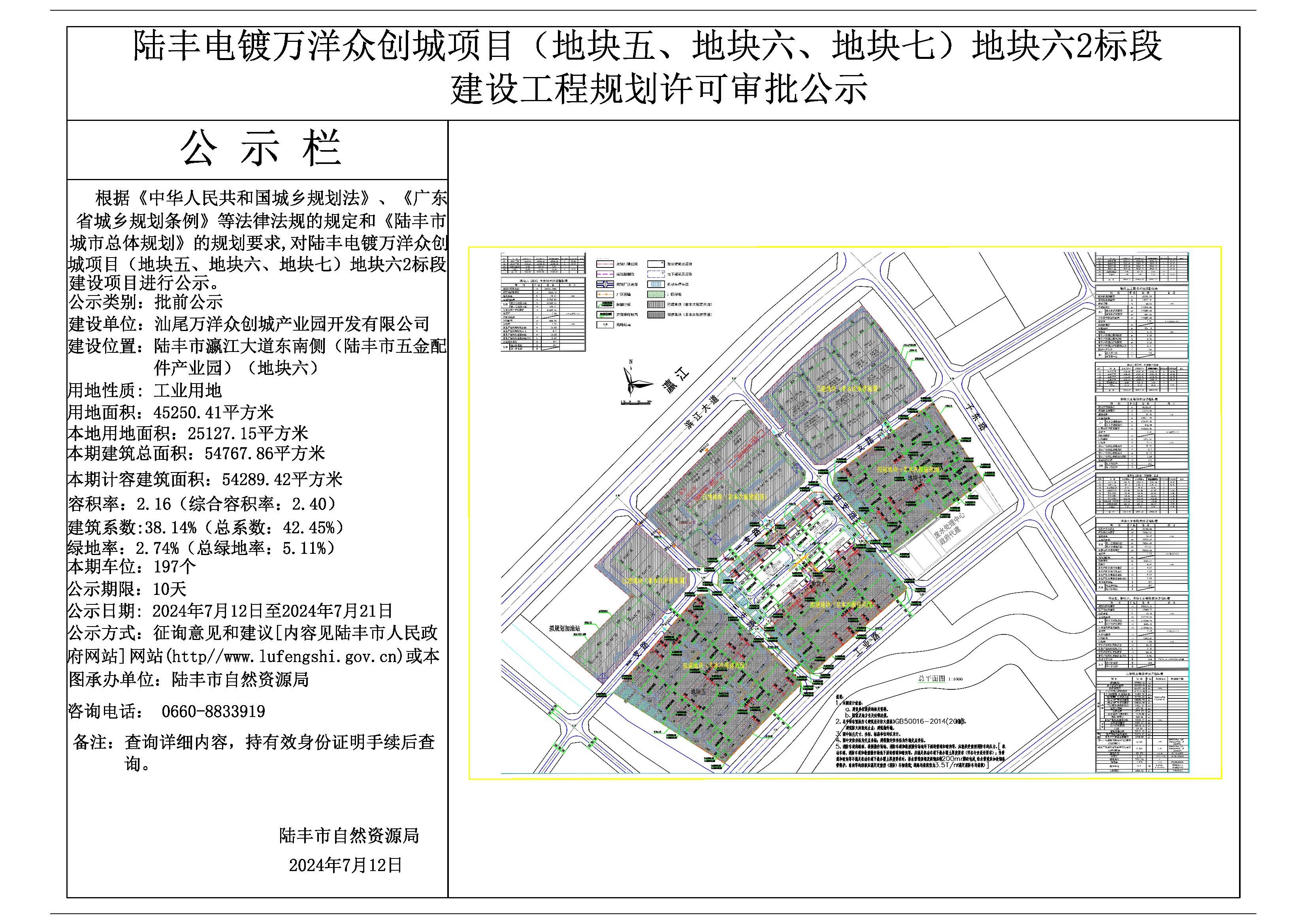 陸豐電鍍?nèi)f洋眾創(chuàng)城項目(地塊五、地塊六、地塊七)地塊六2標段建設工程規(guī)劃許可審批公示