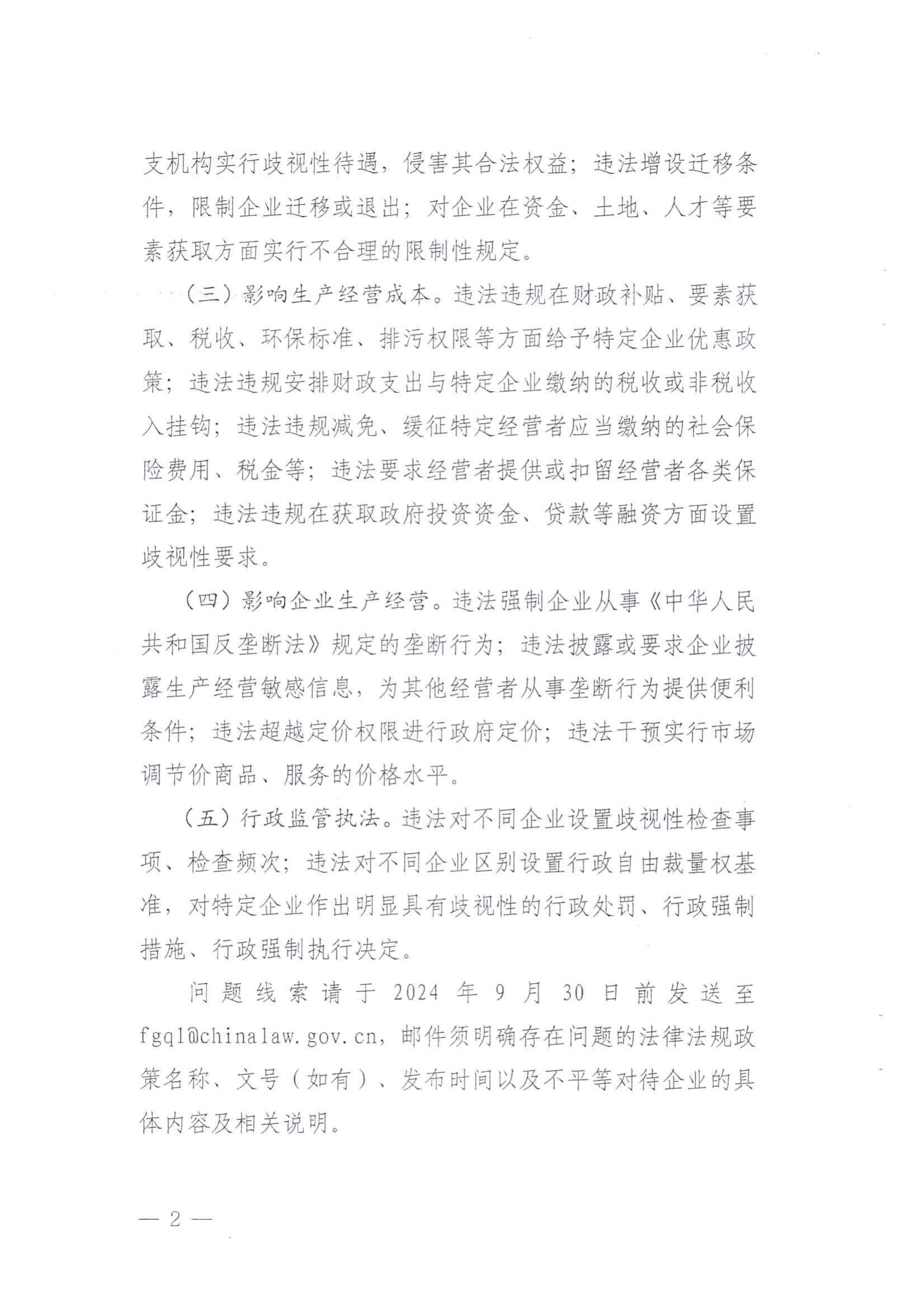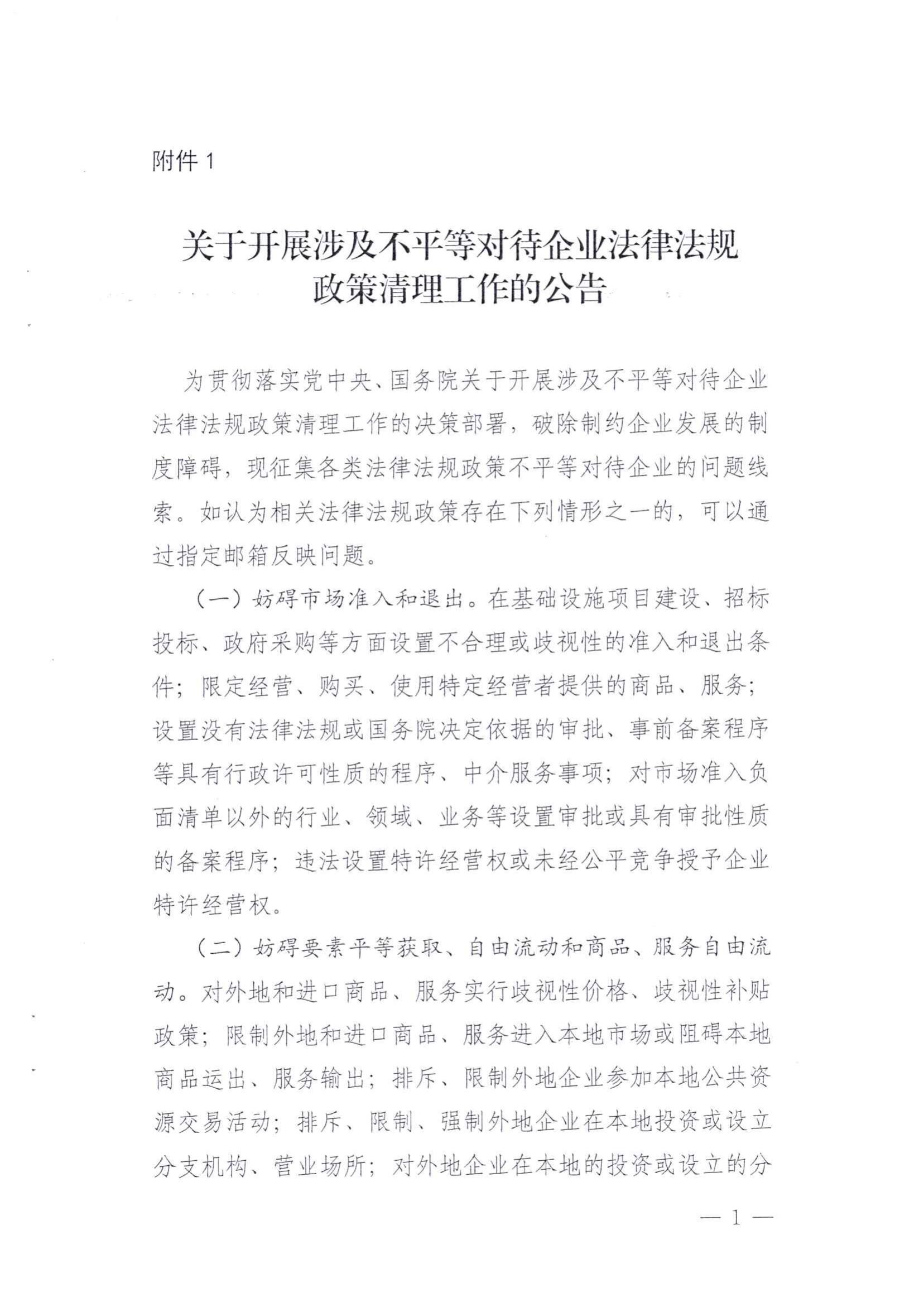 關(guān)于開展涉及不平等對待企業(yè)法律法規(guī)政策清理工作的公告