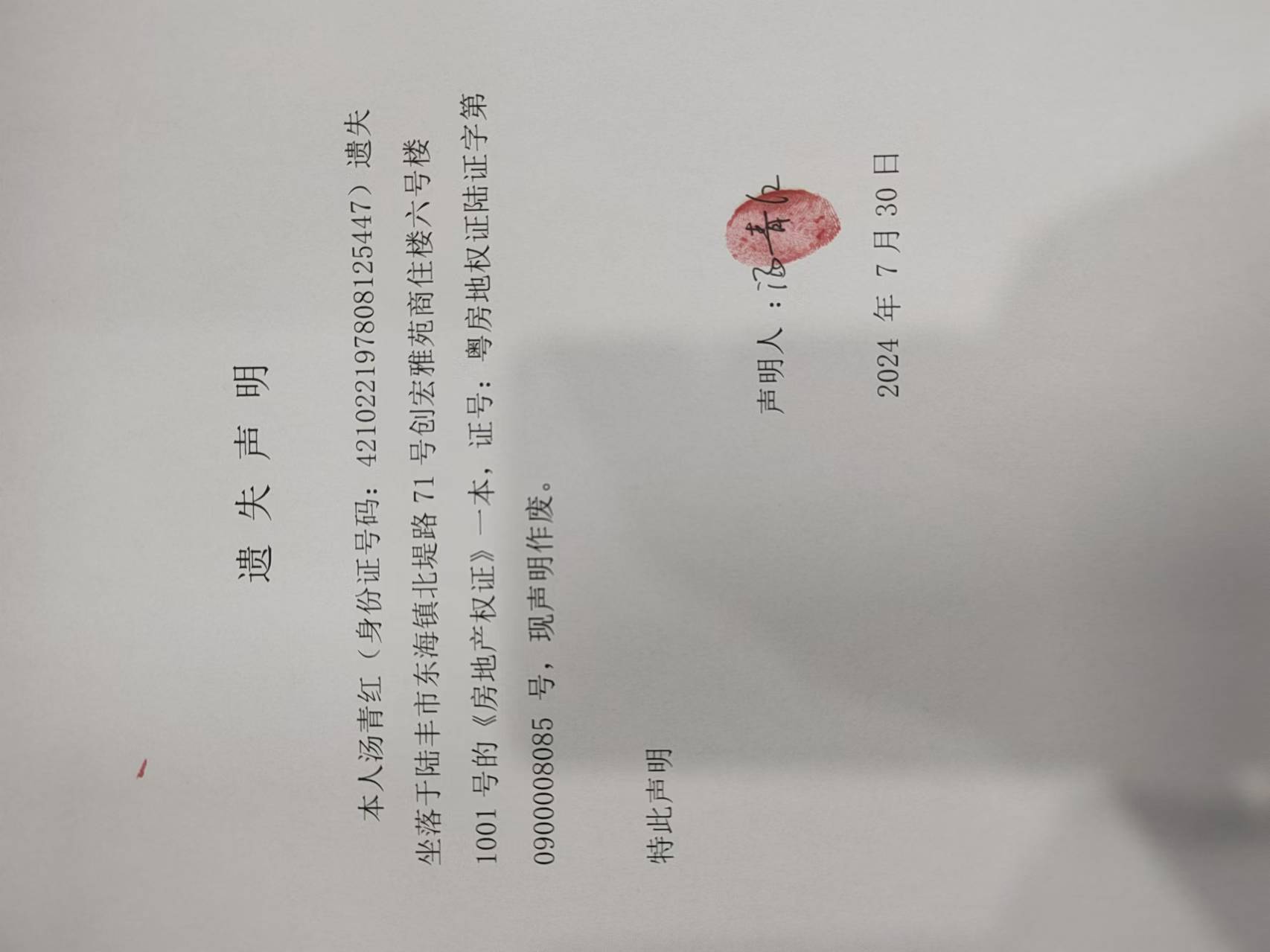 遺失聲明:本人湯青紅遺失坐落陸豐市東海鎮(zhèn)北堤路71號(hào)創(chuàng)宏雅苑商住樓六號(hào)樓1001號(hào)的《房地產(chǎn)權(quán)證》一本,證號(hào):粵房地權(quán)證陸證字第0900008085 號(hào),現(xiàn)聲明作廢。