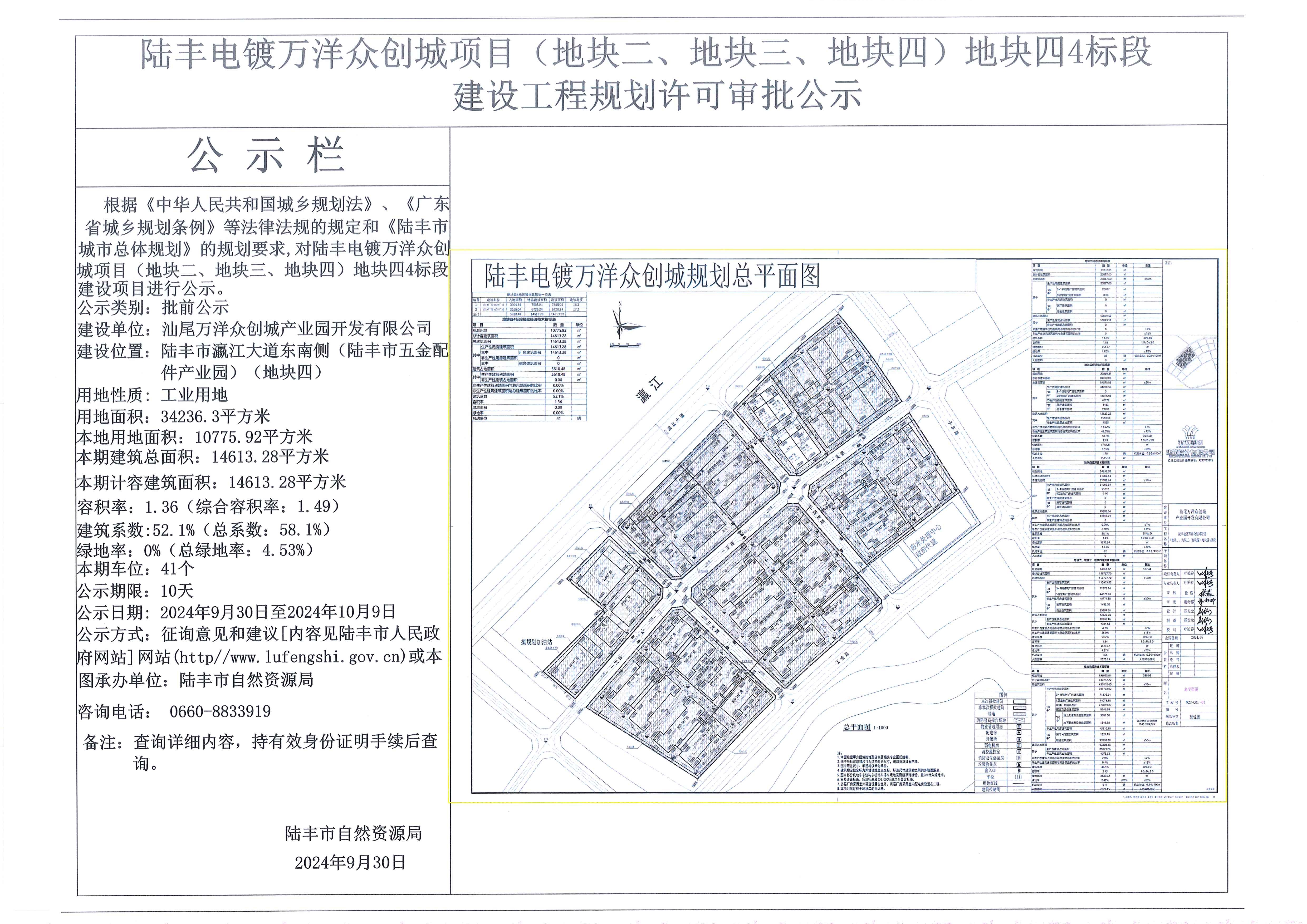 陸豐電鍍?nèi)f洋眾創(chuàng)城項(xiàng)目(地塊二、地塊三、地塊四)地塊四4標(biāo)段建設(shè)工程規(guī)劃許可審批公示