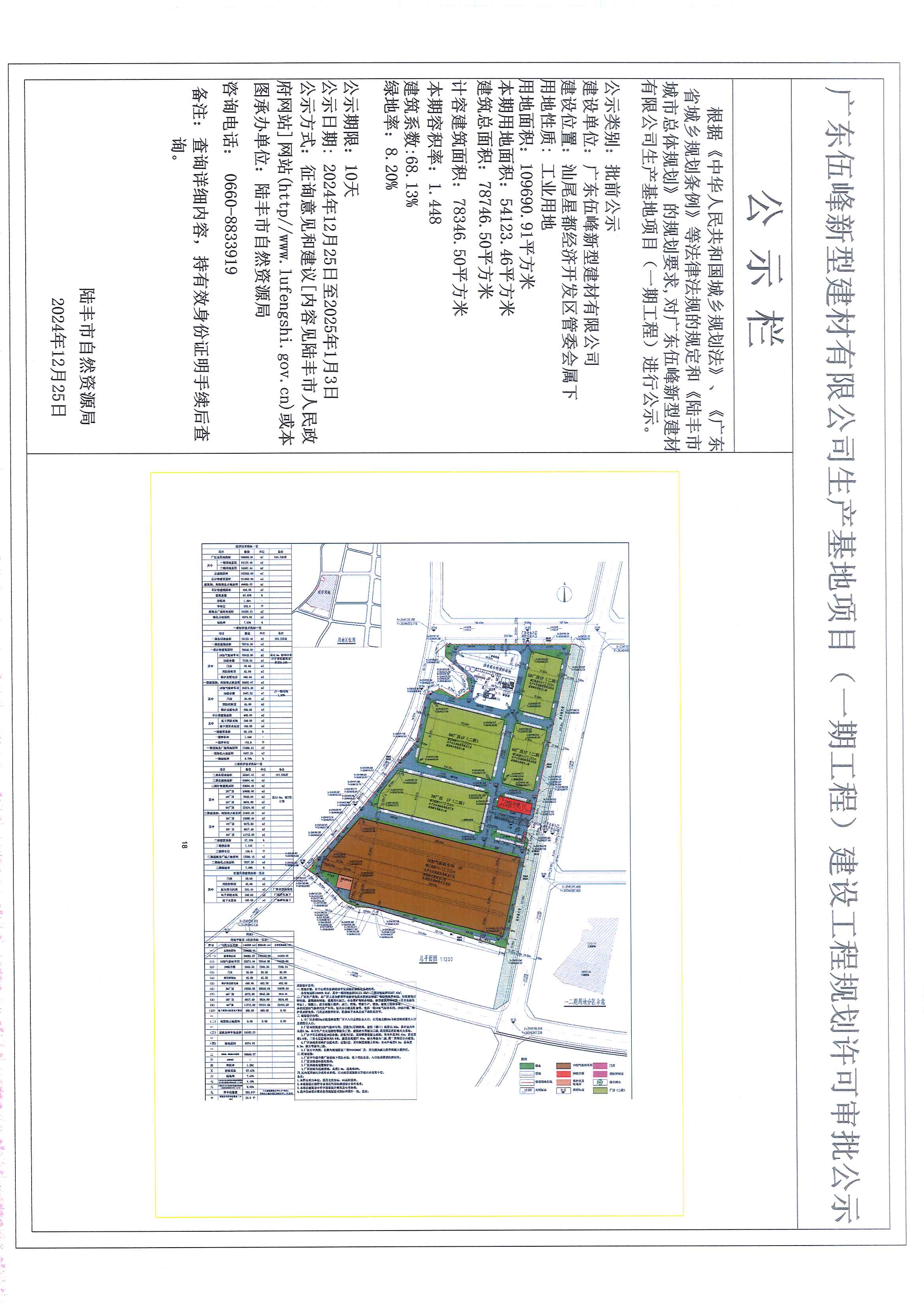 廣東伍峰新型建材有限公司生產(chǎn)基地項目(一期工程)建設(shè)工程規(guī)劃許可審批公示