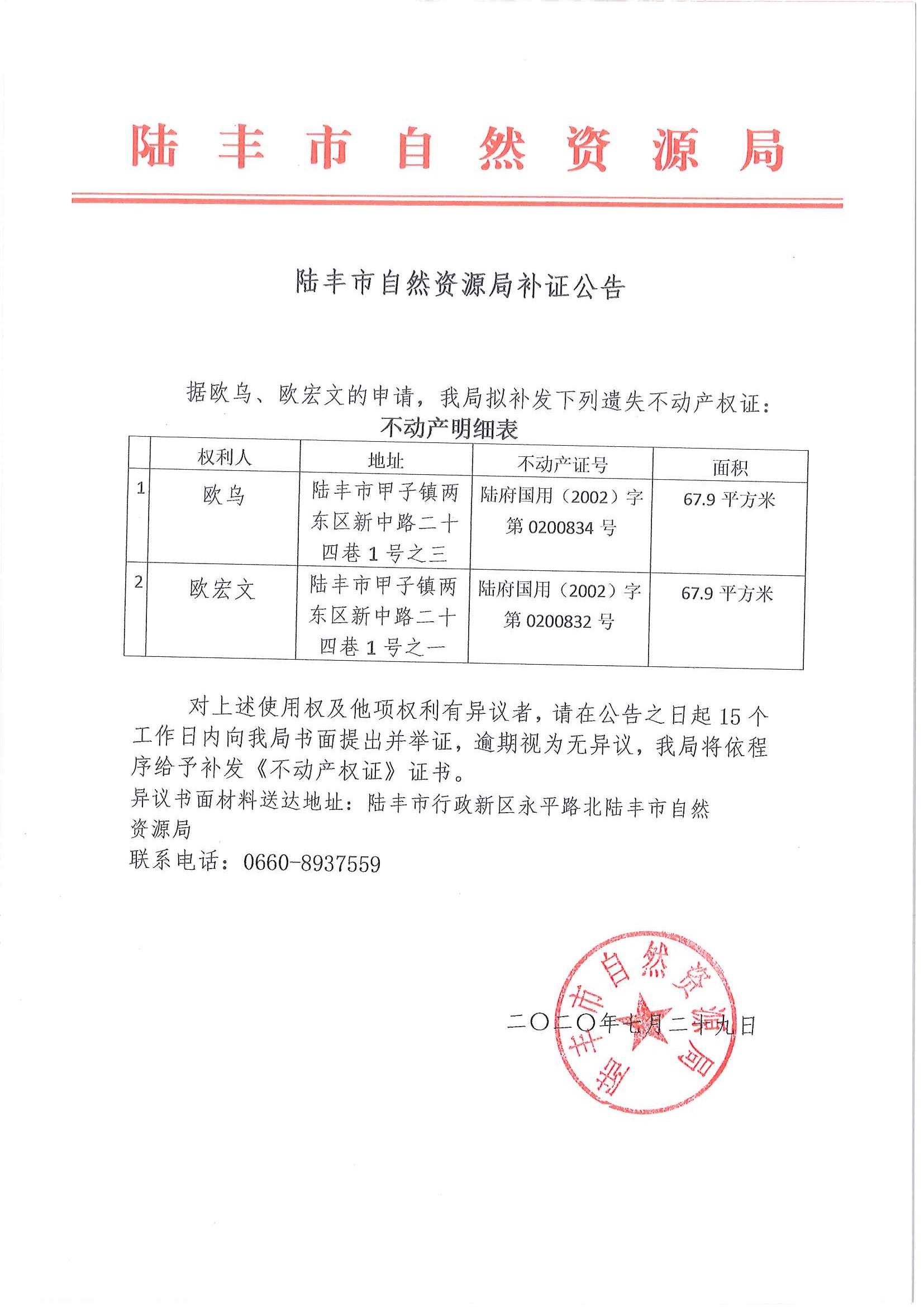 陸豐市自然資源局補證公告(歐烏、歐宏文)