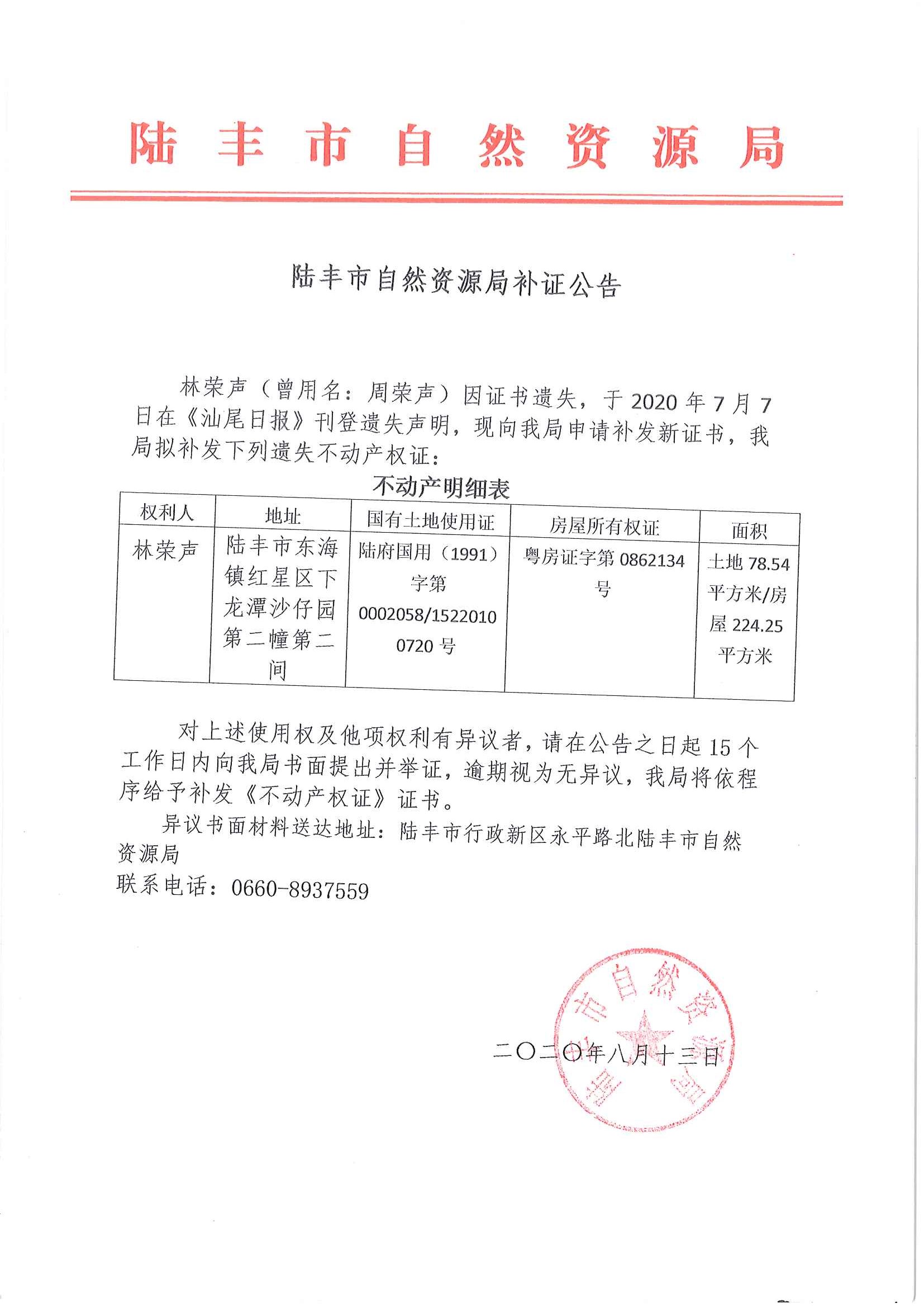 陸豐市自然資源局補(bǔ)證公告(林榮聲)