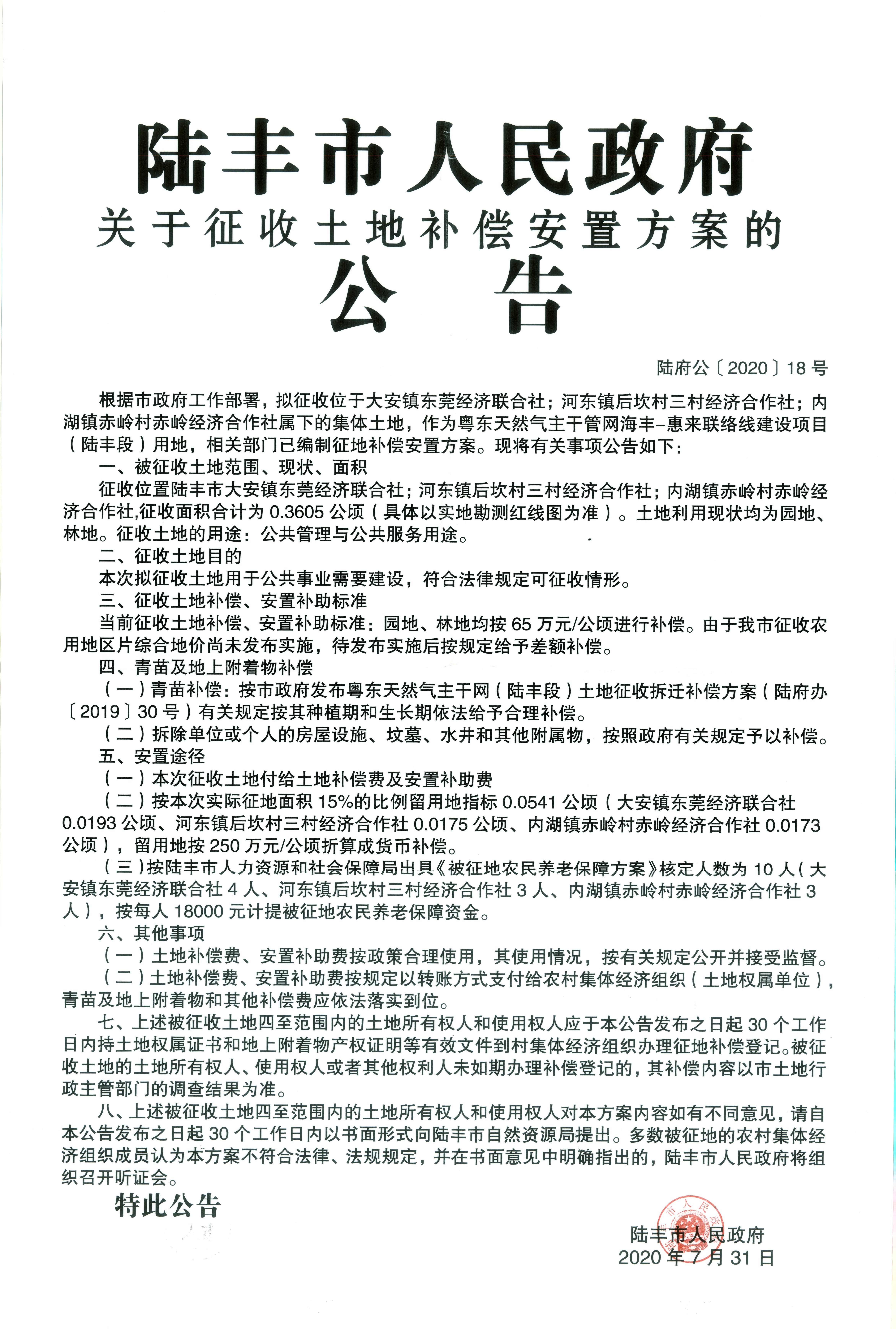 陸豐市人民政府關(guān)于征收土地補(bǔ)償安置方案的公告(陸府公(2020)18號(hào))