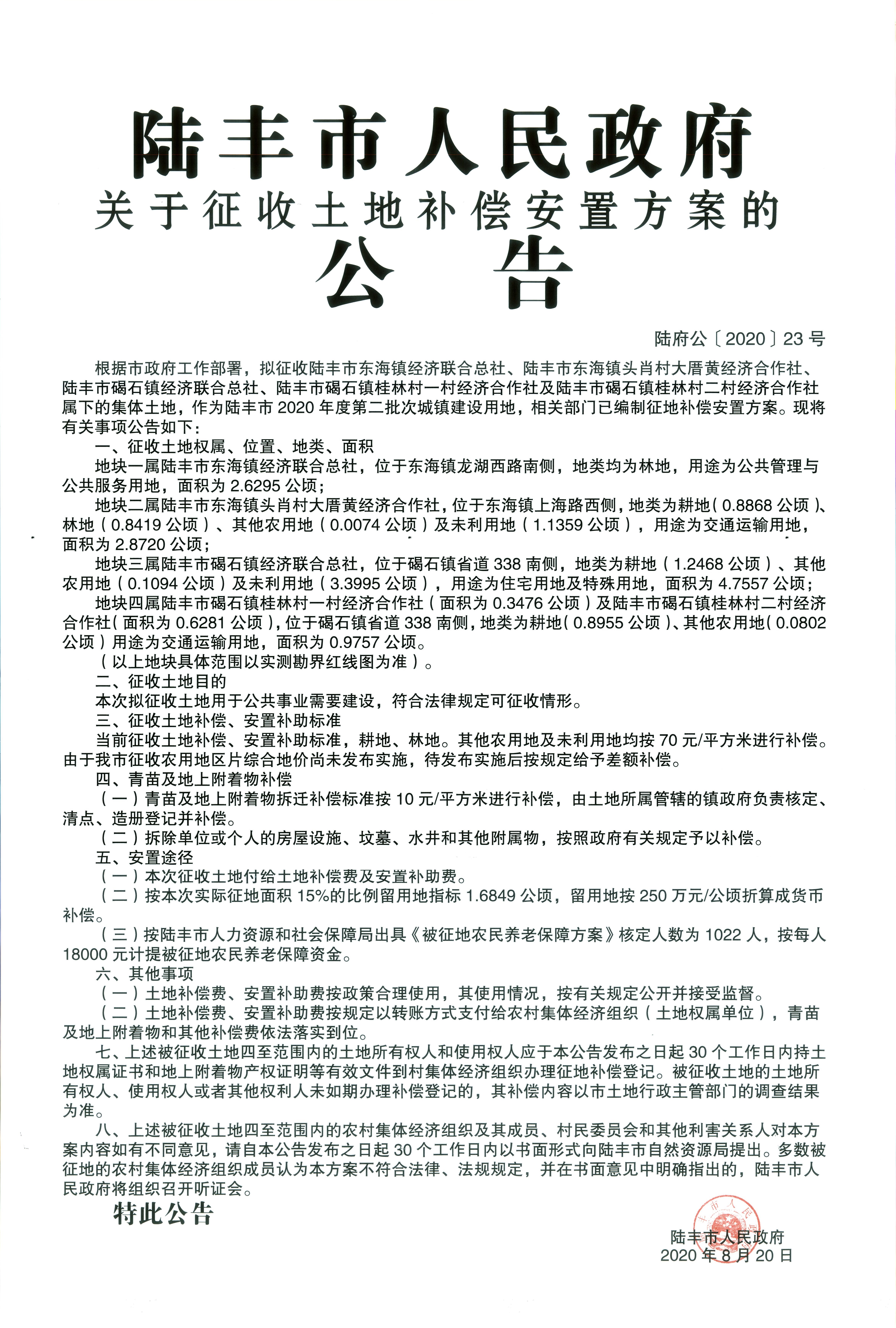 陸豐市人民政府關(guān)于征收土地補(bǔ)償安置方案的公告(陸府公(2020)23號)
